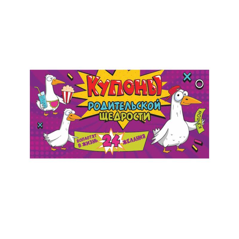 Подарок, который порадует любого первоклассника, дошкольника или школьника — это купоны родительской щедрости! В этой чековой книжке из 24 купонов уже есть приятные сюрпризы: купон на поход в любимое кафе, купон на ночёвку у друзей, купон на дополнительный час за компьютером и другие. Оставшиеся купоны можно заполнить самостоятельно или дать возможность ребёнку придумать свои желания. Как работает брошюра: ребёнок выбирает желание из книжки, аккуратно отрезает купон по пунктиру, отдаёт родителю, чтобы тот исполнил написанное пожелание. Такая брошюра станет отличным дополнением к любому подарку.
