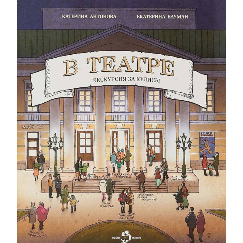 Побывайте за кулисами и в гримёрной, узнайте, как создаются декорации, и посетите театральные сокровищницы - реквизиторский цех и костюмерную. Знакомьтесь с сотрудниками и зрителями, ищите их на каждом развороте и сочиняйте увлекательные истории - о приме-балерине и её застенчивом поклоннике, о рыжей и неугомонной семье Петровых, о задумчивом директоре театра, об уборщице, которая мечтает стать артисткой, и о других героях. Изучайте подписи под рисунками - найдите рампу, парик Мальвины и даже театрального кота.