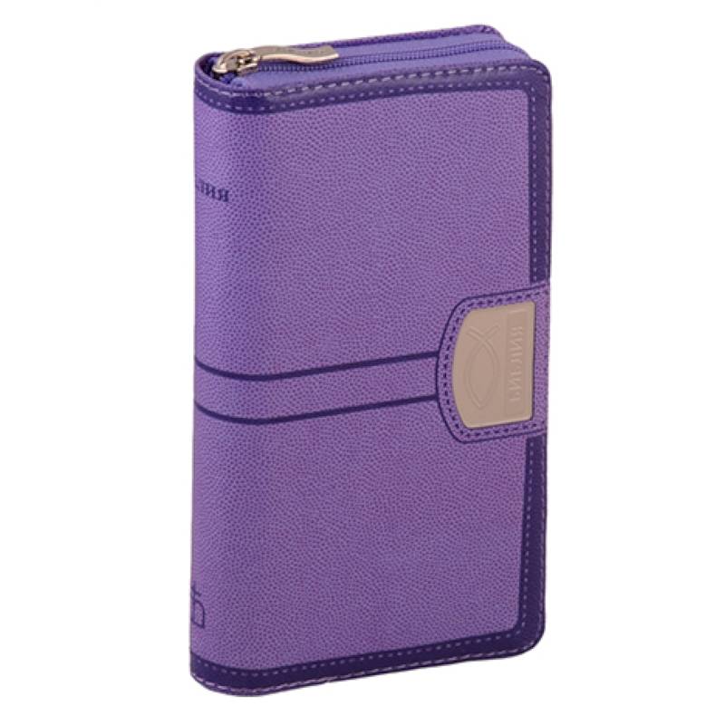 .Формат 83х175 мм, переплет из экокожи на молнии, 'серебряный' обрез с голографическим напылением, закладка, индексы для поиска библейских книг.